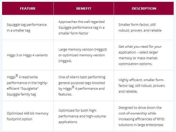 The Alien Technology® “Squiglette” is a narrower version of its high-performance, general-purpose Squiggle® sibling.