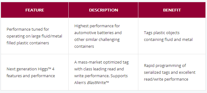 The Alien Technology® ALN-9770 “Bat” RFID inlay is a specialized tag designed for high-performance when applied to automotive batteries and other challenging metal/plastic/fluid containers.
