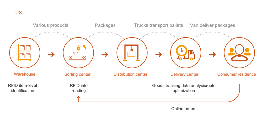 Logistics are one of the core competencies of E-commerce business. The E-commerce industries all over the world are striving to improve the logistics and delivery capabilities and customer experience. They even come up with the concept of two-hour home delivery. However currently the logistics technology and processes can’t meet the requirements for delivery speed and accuracy. RFID system provides multiple- level group read and remote reading capabilities. So that goods can be quickly classified, checked out and delivered. Monitoring of parcel status and location in real time improvs the transparency and efficiency of the logistics system and reduce labor costs.